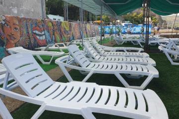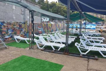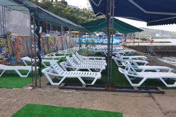 Городской пляж в Партените. Территория для загорания не широкая, покрыта не острой галькой, вход в море ровный и пологий. Рядом находится пирс, но вода не загрязнена проходящими кораблями. Здесь собираются туристы с маленькими детьми. И, конечно же, в нашем поселке доступные цены на отдых в Крыму на берегу моря 2026. Отдыхая на пляже, вы можете получить массу услуг, которые вполне доступны отдыхающим по стоимости.