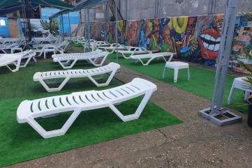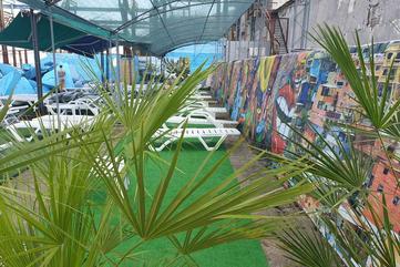 Пляжи "Айвазовского". Заведению принадлежит 4 узких косы, к которым ведут лестницы через парк и зеленые аллеи. На берегах есть лежаки, навесы. Гости полуострова могут удобно расположиться на летних террасах, чтобы насладиться не только едой, но и красивым морским пейзажем.